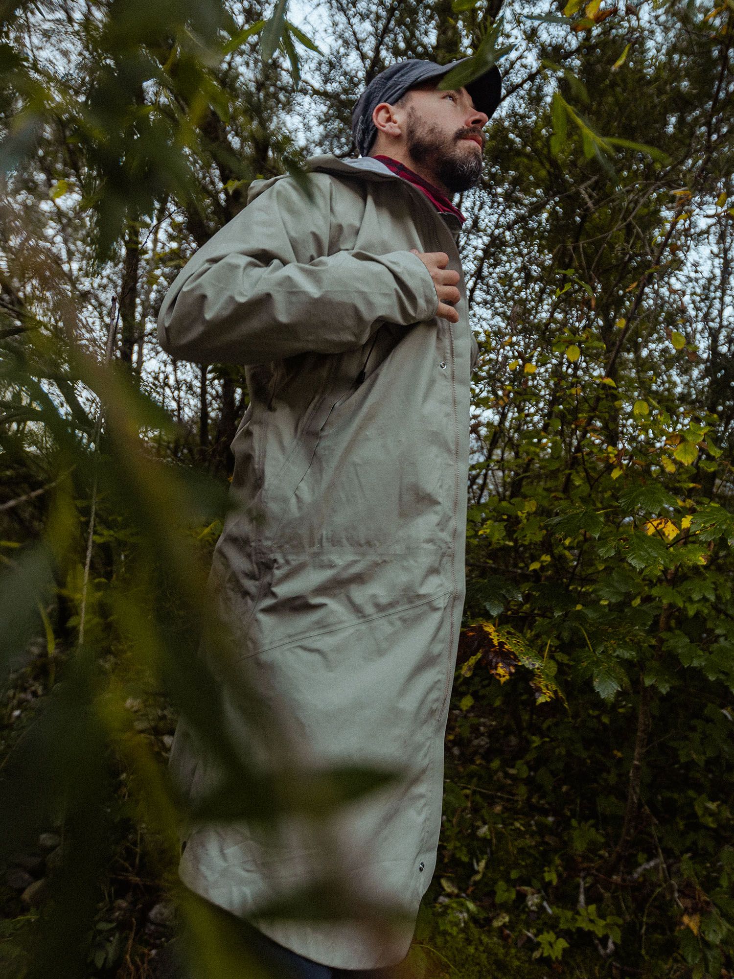 Syr ist ein übergroßer, wasserdichter und gut verstaubarer Regenparka mit Kapuze und leicht verlängerter Vorderseite für Wanderungen bei unvorhersehbarem Wetter.
